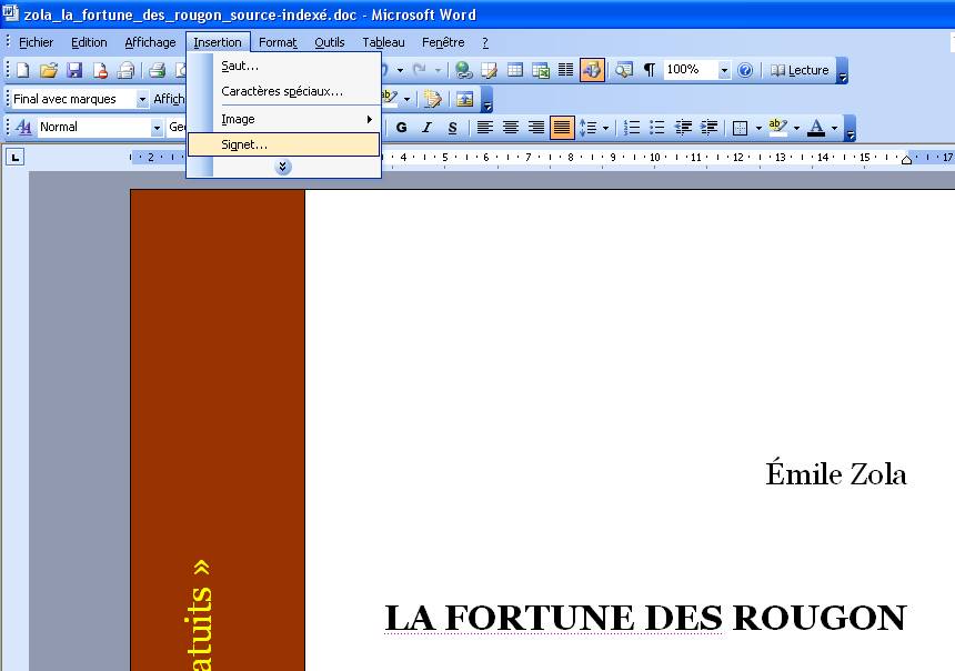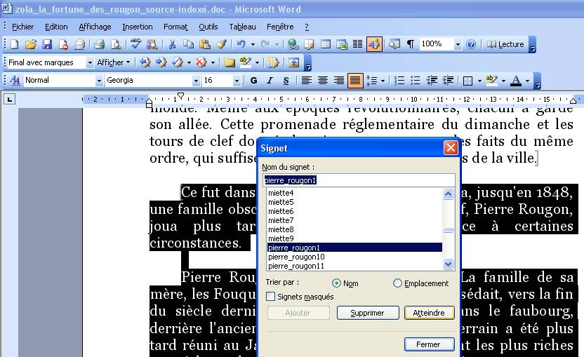 3/ Dans WORD, cliquez sur "insertion" puis 'signet". chosissez le signet correspondant à votre sujet d'exposé : j'ai indexé entre 10 et 40 passages, suivant les sujets, pour vous premettre de retrouver facilement les passages concernant votre sujet. Les passages sont numérotés dans l'ordre suivant :